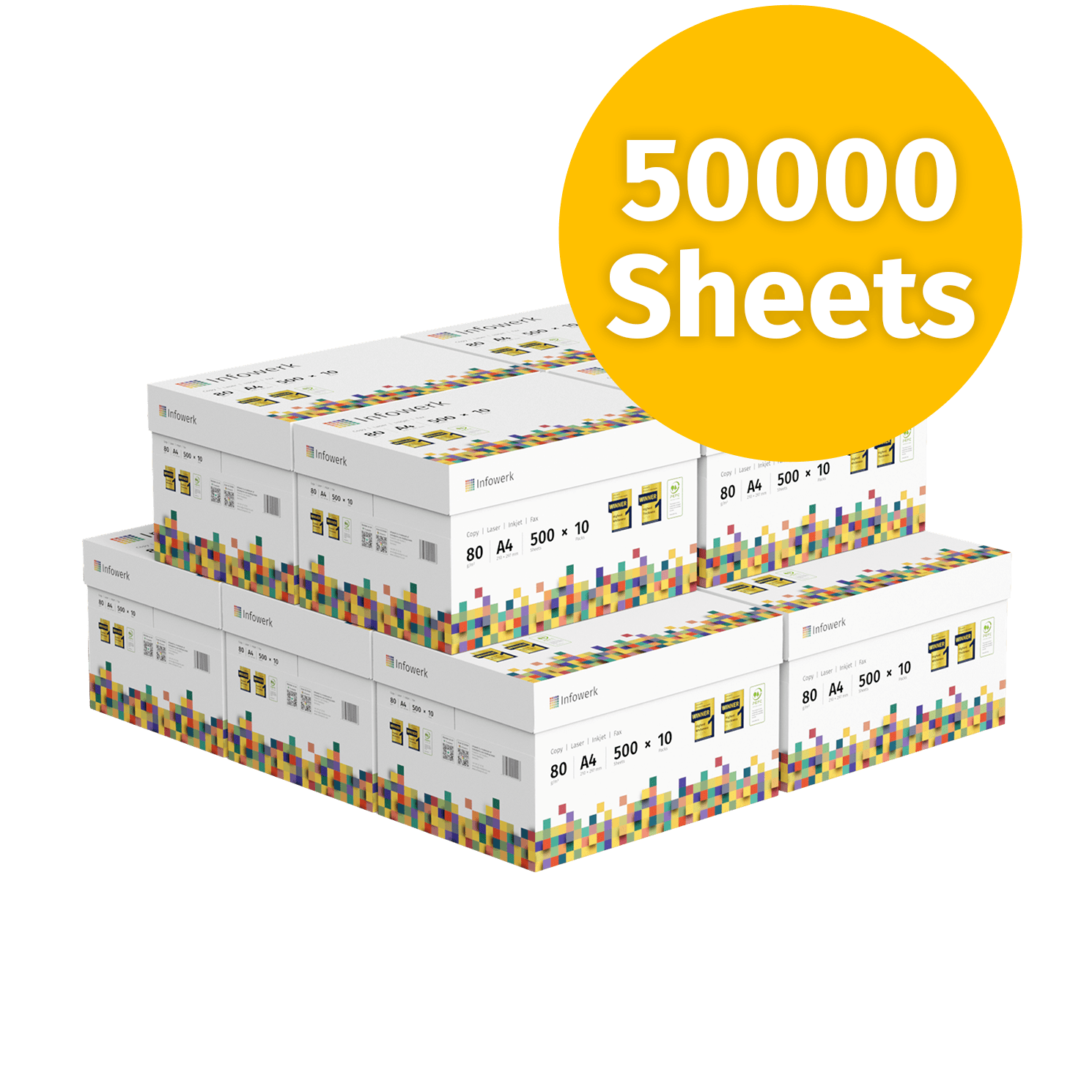 Vous êtes à la recherche d'un papier pour imprimante / papier pour photocopieuse de haute qualité ? Vous avez frappé à la bonne porte ! Vous serez particulièrement impressionné par la blancheur éclatante (CIE 160) de notre papier pour imprimante / papier pour photocopieuse Infowerk. Grâce à son grammage de 80 g/m², il atteint également les meilleures valeurs (95 %) en matière de transmission/opacité de la lumière.